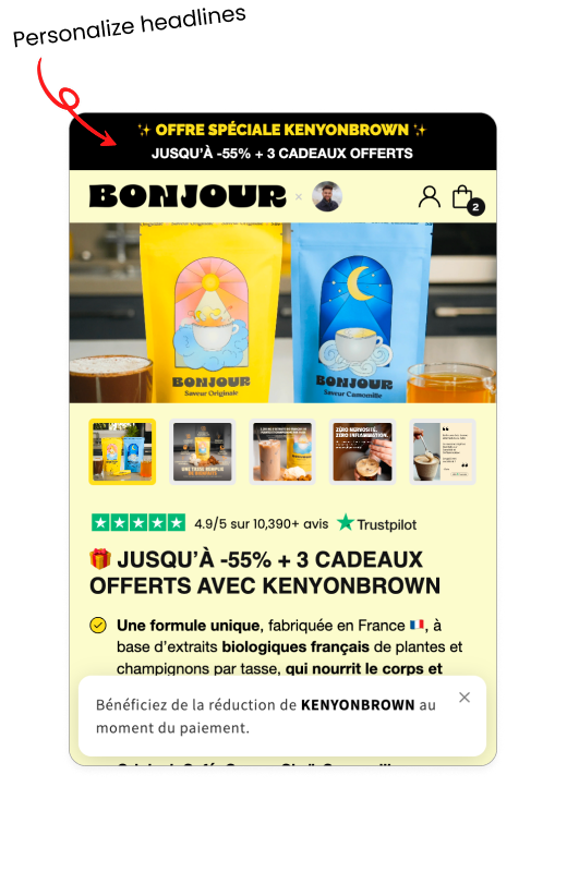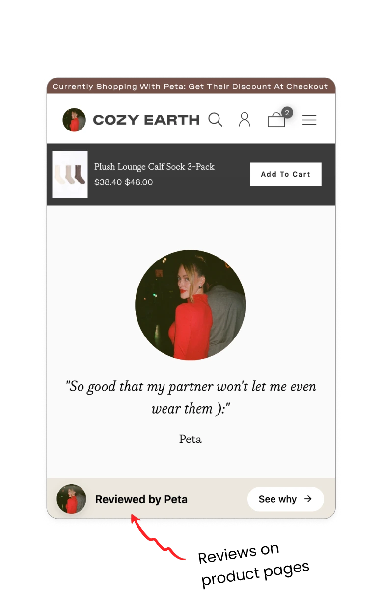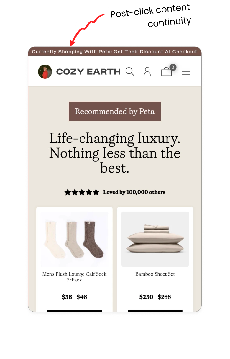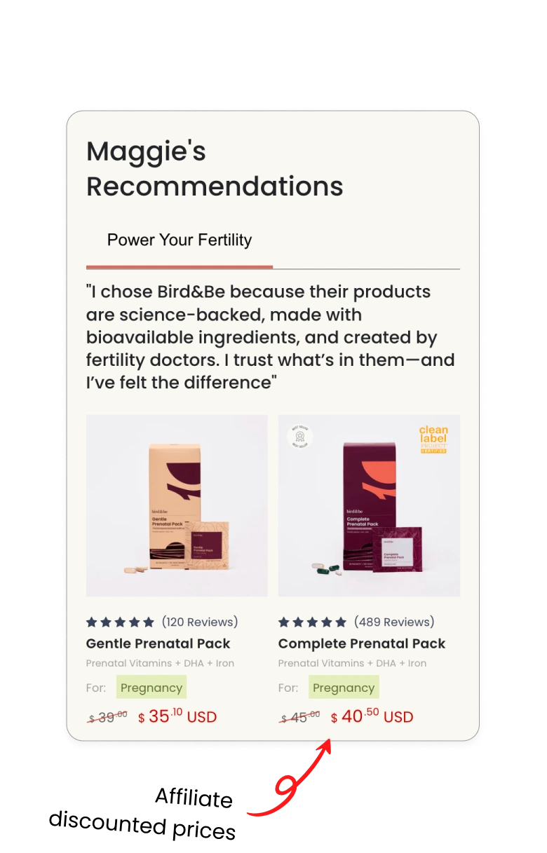 Showcase personalized content behind your affiliate links or partner ads. Inject creator UGC, discounts, bios, logos, bundles, lookbooks, recipes, reviews, and so much more.