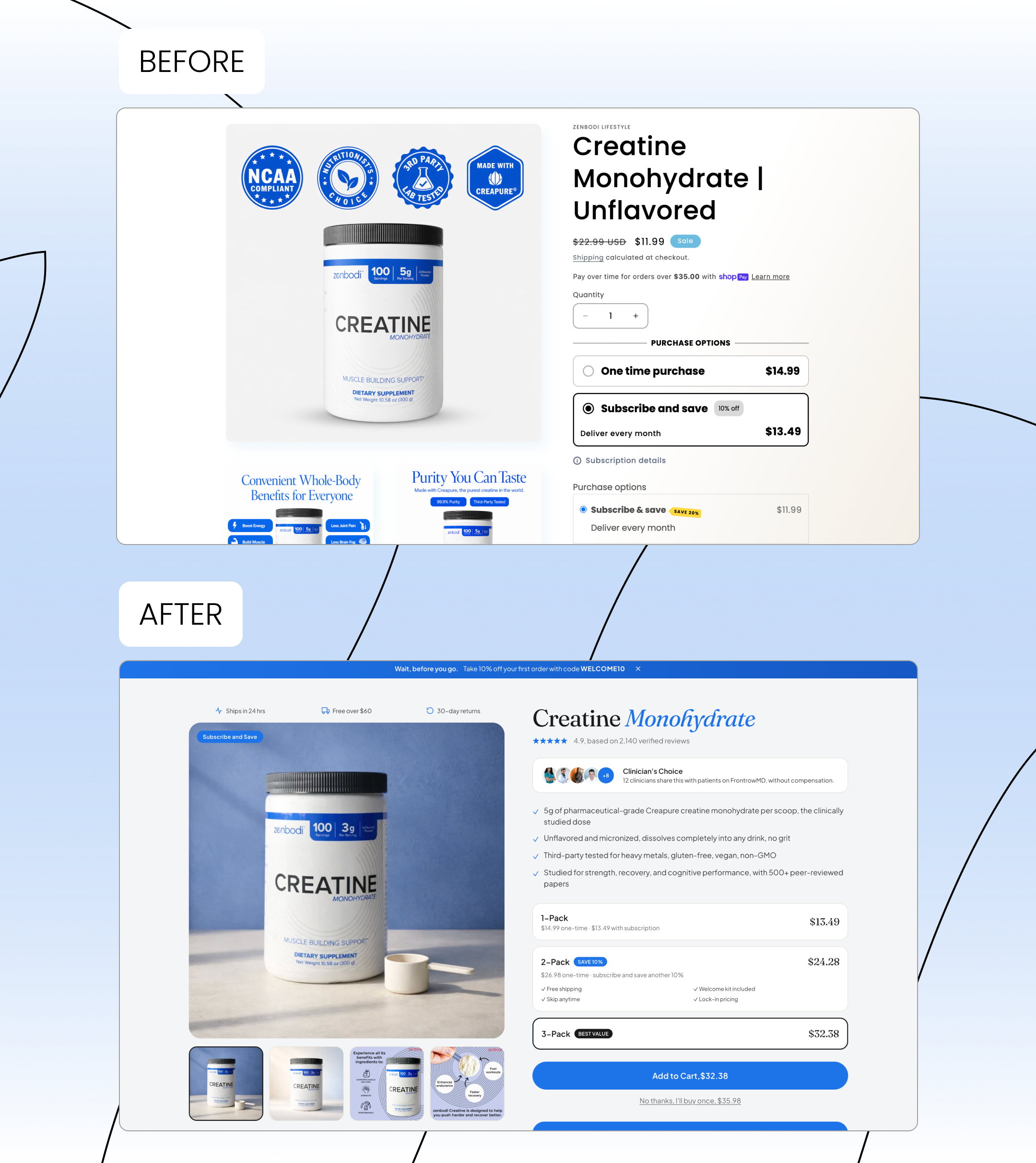 The product page leaned on logos and bullet points instead of the proof Zenbodi's audience actually responds to — clinician endorsement, third-party testing, real reviews. The hero treated the homepage like a brochure rather than a video-first experience that mirrors how their customers find the brand on Instagram and TikTok. And the key elements from navigation, to the footer, to informational elements on the store missed the moment to establish a brand.