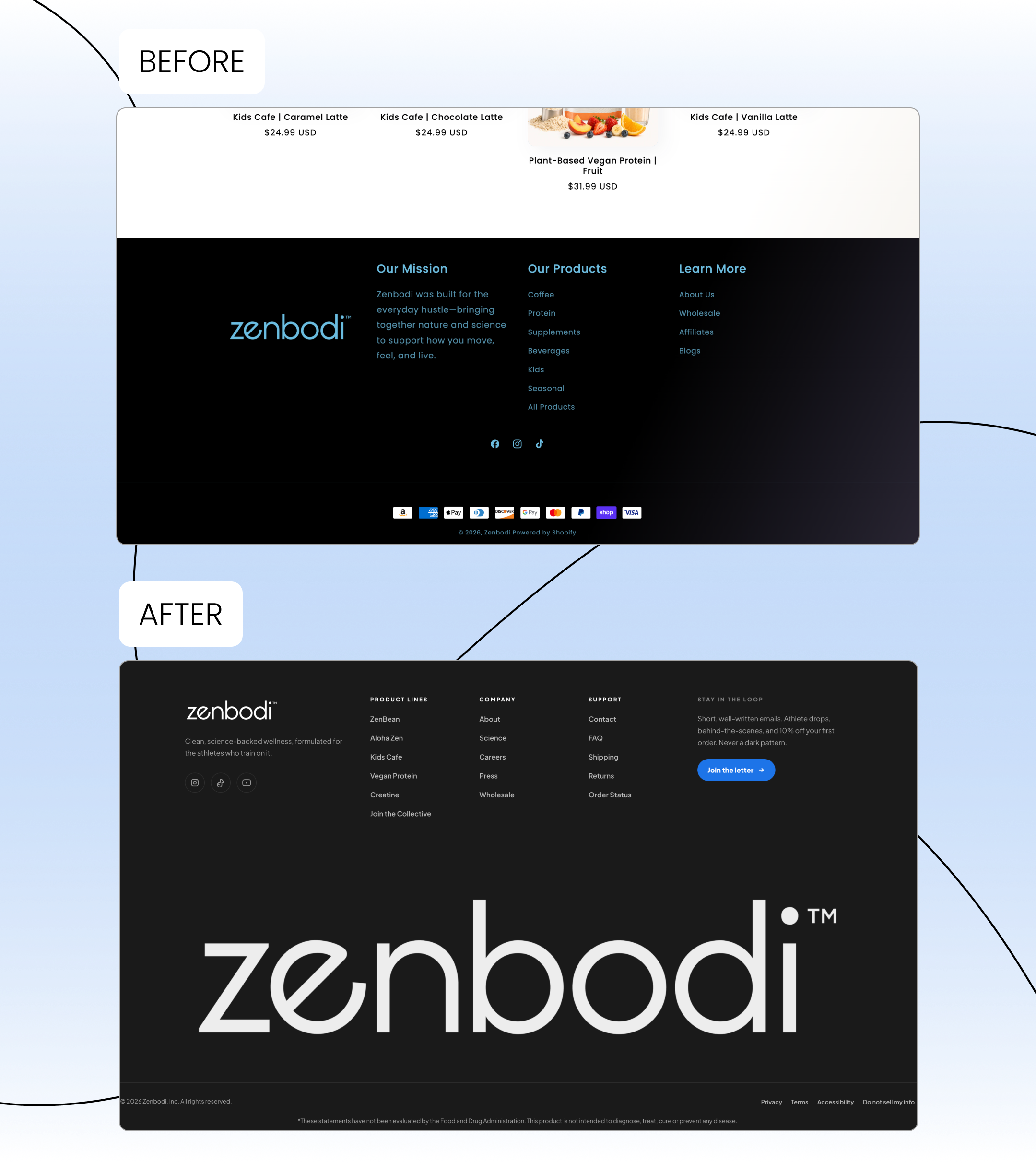 Zenbodi had a problem most growing wellness brands have: the website was a placeholder. They were running a stock Shopify theme with a card-and-stock-photo hero, generic supplement-aisle PDPs covered in trust-badge clip art, and a footer that was little more than a directory.