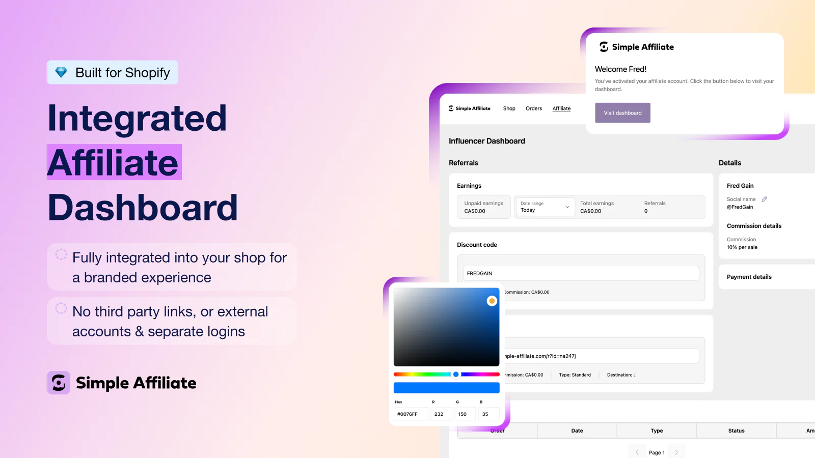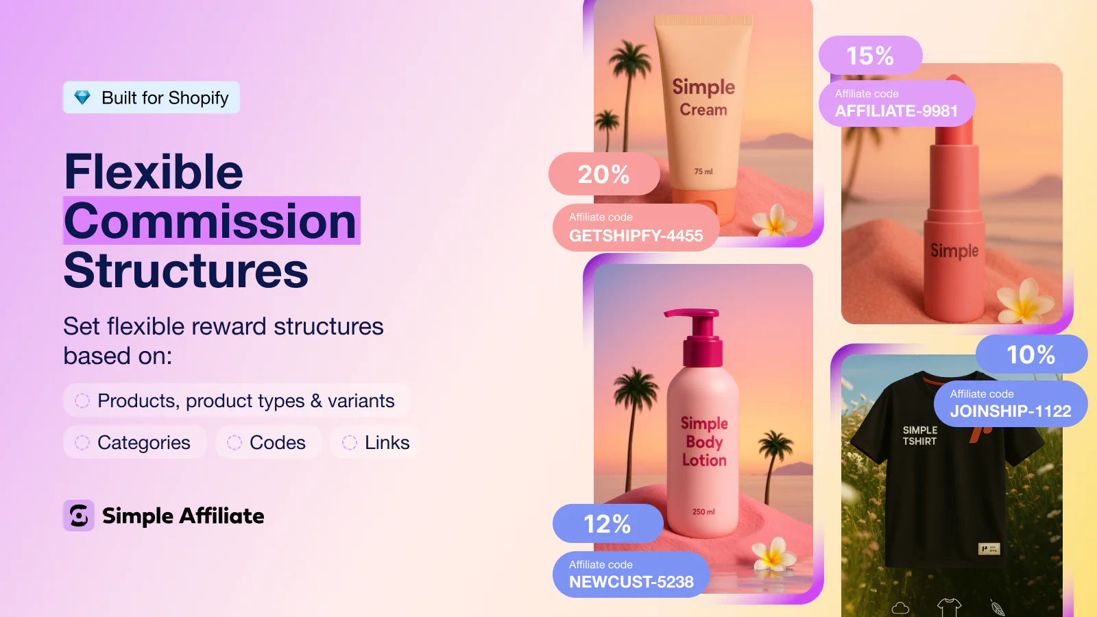 Use Simple Affiliate to run a Shopify-native affiliate program — with self-service signup, cookie tracking, autopay, and tax forms — and CreatorCommerce to turn every link into a co-branded store.