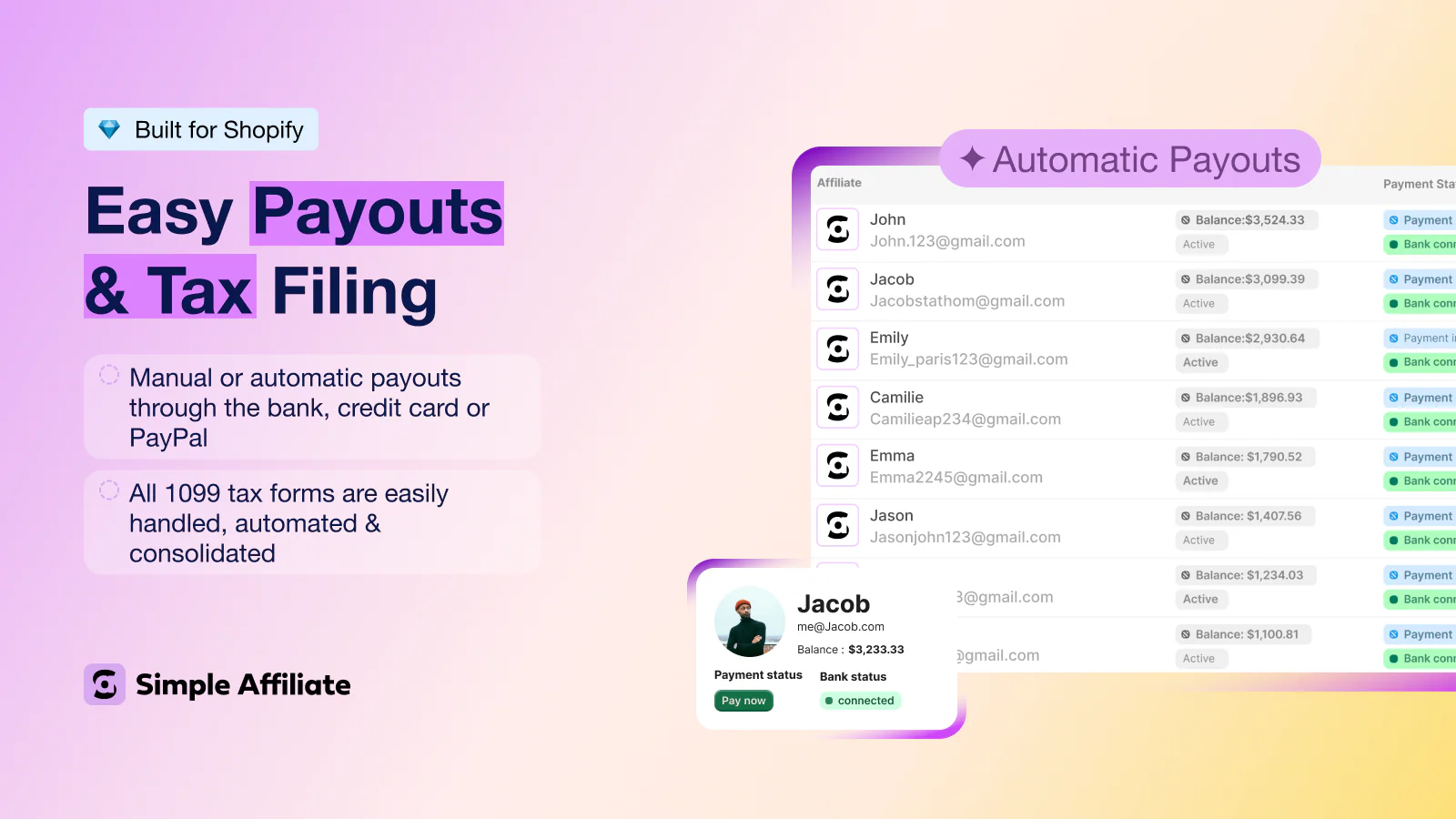 Simple Affiliate's autopay pushes commissions to your affiliates via Stripe bank transfer or card, handles multi-currency, and auto-generates, consolidates, and files 1099 tax forms at year end — a major relief for US-based programs. Commissions earned from CC shop orders route through the same payout engine, so there's no separate reconciliation step.