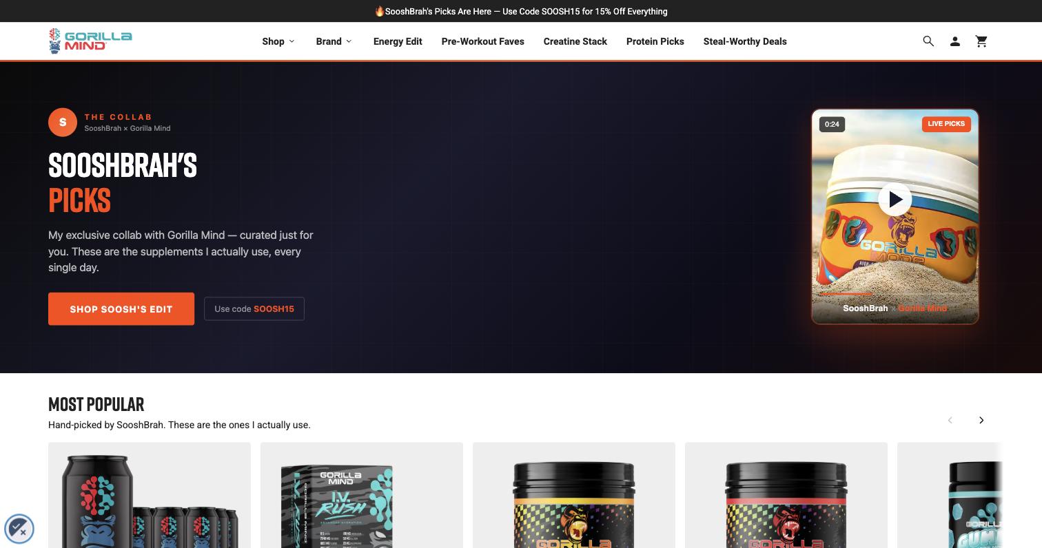 Product seeding accelerates activation. Instead of waiting for creators to stock their shelves and film reviews, Gorilla Mind sends each partner a curated bundle aligned with their content theme (e.g., SooshBrah's pre-workout + pump stack, James English's nootropic + energy stack). The creator unboxes, tests, and goes live—then the co-branded storefront goes live 48 hours later. No friction. No lag.